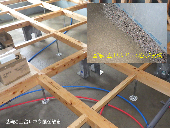 基礎や断熱材、木部の土台、柱・間柱にホウ酸を散布。