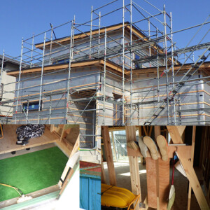本日は現場にて、福田温熱空調さんによる気密測定の日でした。高気密住宅を建てる際、利便性の高い「玄関引き戸」を採用すると、どうしても気密への影響が懸念されます。