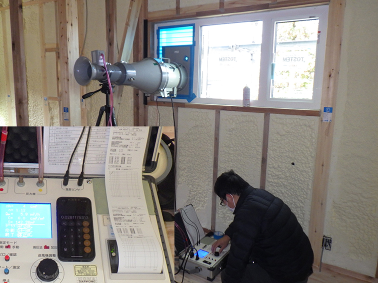 設計段階での予測だけでなく、こうして現場で実測することで、部材ごとの特性を正しく把握することができます。気密性能は、暮らし始めてからの光熱費や快適性に直結します。数値に妥協しない家づくりを改めて実感した一日でした。