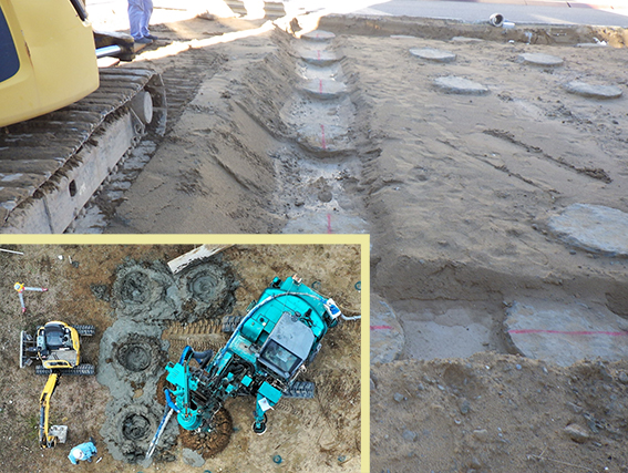 後日、改良した柱の周りの土を取り除き、設計図通りの正確な位置に改良が施されているか、建物配置とのズレがないかを厳しくチェックしました。その結果、計画通りの位置に地盤改良が行われていることを確認できました!